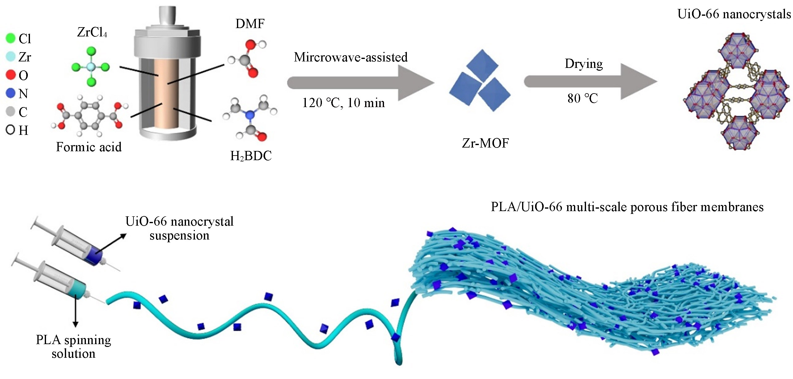 利用微波辅助法精准控制锆基金属有机框架(UiO-66)的尺寸和形貌, 制备了具有高散射效率的UiO-66纳米晶; 以其作为高红外辐射功能材料, 结合静电纺丝-电喷雾技术和相分离策略, 进一步构建了UiO-66功能化的聚乳酸(PLA)多级孔纤维膜(PLA/UiO-66). 得益于微-纳米结构多级孔和UiO-66引入的丰富红外活性基团, PLA/UiO-66多级孔纤维膜展现出良好的太阳反射率和红外发射率, 当UiO-66的添加量(质量分数)为12%时, 所制备的PLA/UiO-66-12多级孔纤维膜的光学性能更加突出, 其平均太阳反射率和平均红外发射率分别高达93.9%和91.2%, 远高于Pure PLA纤维膜. 在户外测试中, PLA/UiO-66-12多级孔纤维膜的降温幅度明显优于Pure PLA纤维膜, PLA/UiO-66-12纤维膜的平均温度维持在47.6 ℃, 而Pure PLA纤维膜的平均温度则高于50 ℃. 由于UiO-66的引入有效降低了表面能, 使PLA/UiO-66多级孔纤维膜具有较大的水接触角(128.8°), 确保其具有优异的疏水性和自清洁能力, 为研制高效、 可持续的热管理纺织品提供了新策略.