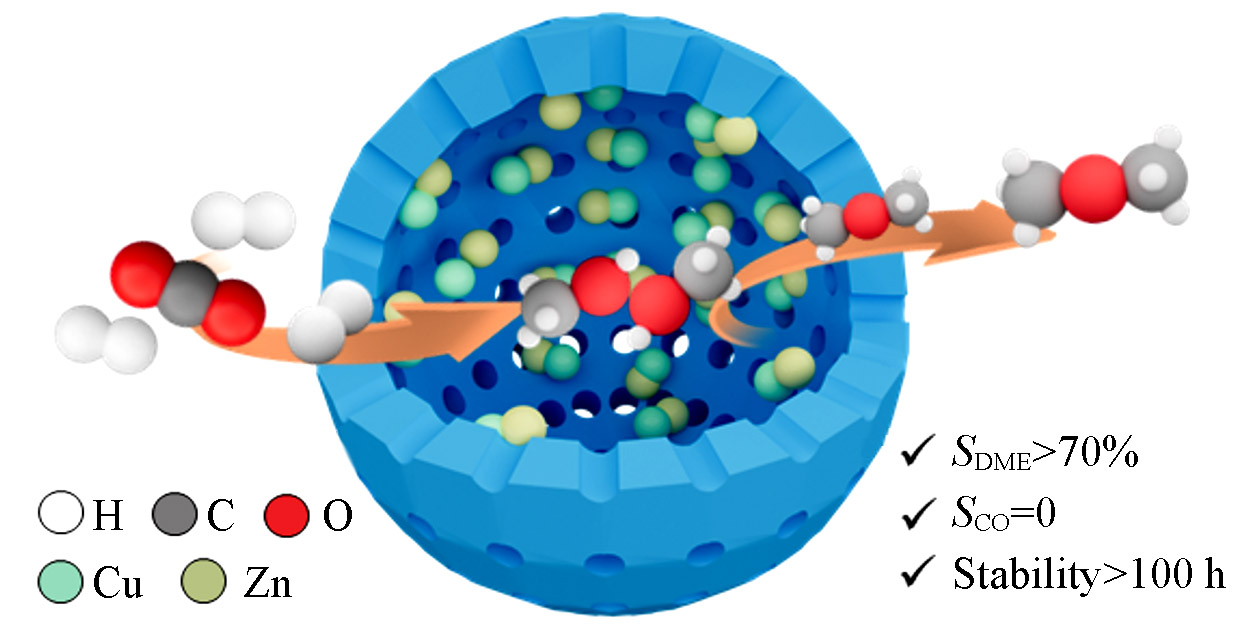 采用溶解再结晶策略合成了一系列中空Cu-ZnO@H-HZSM-5纳米反应器, 并考察了其对CO2加氢直接制二甲醚反应的催化性能. 结构表征结果显示, 催化剂为中空结构, Cu和ZnO物种以粒径约2.8 nm的颗粒形式高度分散在分子筛中空腔体内部, 壳层主要为硅铝分子筛. 研究结果表明, 在分子筛壳层骨架中引入Al原子可实现分子筛骨架酸强度和酸量的有效调控, 该纳米反应器有效抑制了逆水煤气副反应的发生, 二甲醚的产率可达55.4 mg·gcat-1·h-1, 稳定反应100 h未见明显失活.