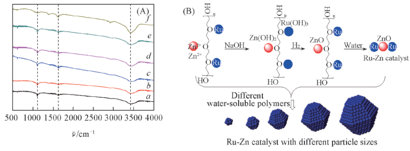 Ru-Zn catalysts modified by water soluble polymers were prepared by a precipitation method. The catalysts after hydrogenation were characterized by X-ray diffraction, transmission electron microscopy, energy dispersive spectroscopy, X-ray photoelectron spectroscopy and N2 physisorption. It was found that the type of water-soluble polymers and the dosage of PEG-20000 imposed a remarkable effect on the particle size of Ru. With the Ru particle size in Ru-Zn catalysts increasing, benzene conversion decreased, and the maximum cyclohexene yield showed a volcanic-type variation tendency. When the Ru particle size of the Ru-Zn catalyst modified by 0.4 g PEG[m(PEG-20000)∶m(Ru)=0.2] was 4.8 nm, a maximum cyclohexene yield of 62.2% was obtained on this catalyst. The Ru particle size could produce an effect on the Zn/Ru atomic ratio on the catalyst surface, which was the primary reason why the Ru particle size could affect the performance of Ru-Zn catalysts.