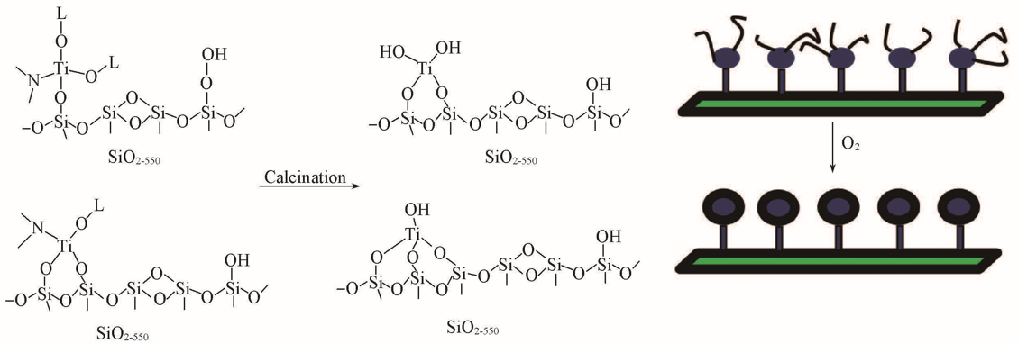 以普通硅胶为载体, 采用表面金属有机化学合成技术, 通过“一锅”反应制备了硅胶表面金属有机钛化合物, 然后经高温煅烧获得了硅胶表面氧化钛. 采用傅里叶变换红外光谱(FTIR)、 X射线光电子能谱(XPS)、 热重分析(TG-DTA)及原子力显微镜(AFM)对硅胶表面金属有机钛化合物和表面氧化钛进行了结构表征. 结果表明, 高温煅烧过程中, 硅胶表面金属有机钛化合物不仅脱除了有机配体, 并且通氧使其表面“再生”羟基, 确保了钛的四配位形式不变; 氧化钛通过Si—O—Ti键锚定在硅胶表面, 呈分散、 孤立状态分布. 高温煅烧后, 硅胶的骨架结构保持完好.
