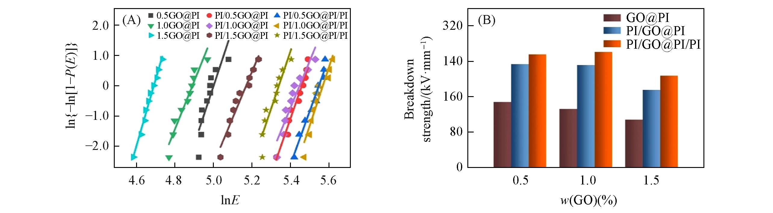 采用逐层涂布、 分层控制固化程度的方法, 利用聚酰胺酸(PAA, 聚酰亚胺前体)溶液和含有氧化石墨烯(GO)的PAA溶液制备了一系列由高绝缘性PI层与GO@PI介电层交替组合而成的界面清晰且紧密衔接的多层复合薄膜. 通过调控介电层中GO含量及分层结构, 使多层复合薄膜兼具高介电常数和高击穿强度特征. 结果表明, 三层复合薄膜PI/1.0GO@PI/PI的击穿强度为261.5 kV/mm, 储能密度达到1.27 J/cm3, 与相同介电层厚度的单层薄膜相比, 击穿强度和储能密度分别提高了97%和144%, 同时, 其介电损耗也保持在较低水平(tanδ=0.0079). 绝缘层和高介电常数层的协同作用提升了氧化石墨烯/聚酰亚胺复合薄膜的储能密度. 这种简单的多层结构设计有利于氧化石墨烯/聚合物复合材料在介质储能领域的应用.