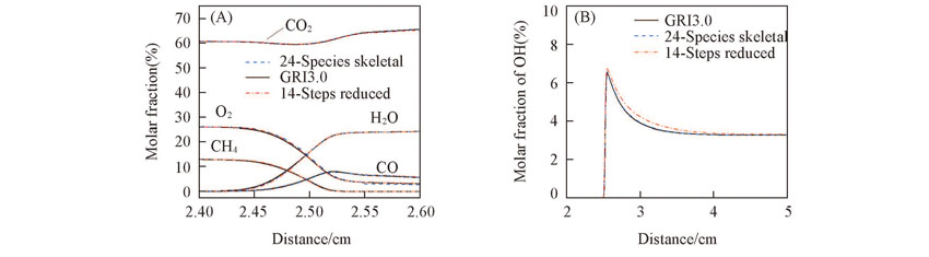 Fig.6 Predictions of flame structure of CH4/O2/CO2 mixtures with 24 species skeletal mechanism, 14 steps global reduced mechanism and detailed mechanism(A) CH4 and H2O; (B) CO; (C) OH. n(CH4)/n(O2)=0.50, n(O2)/n(CO2)=0.24/0.76, T=1200 K, p=101325 Pa.