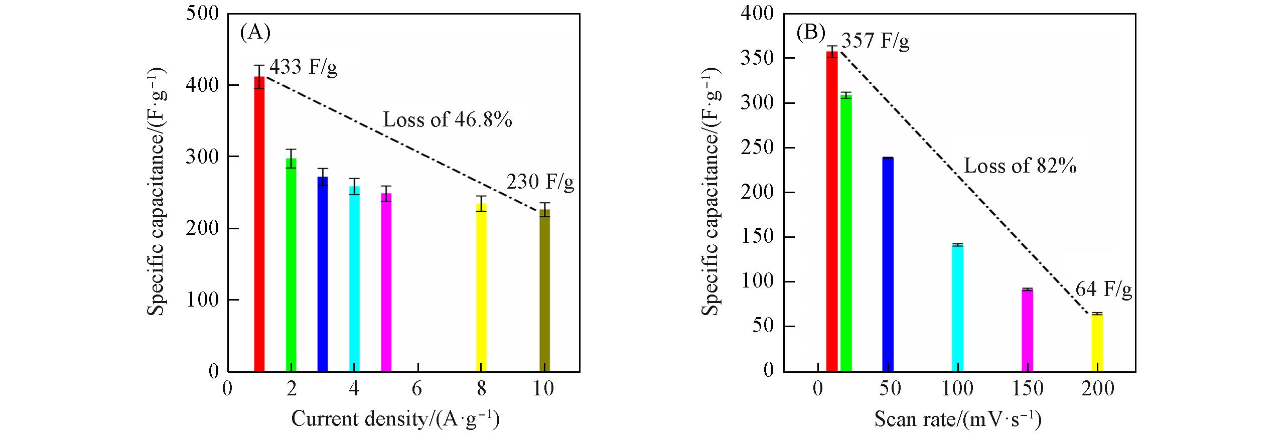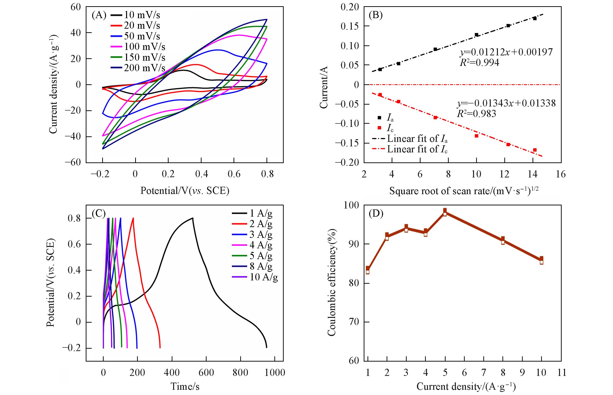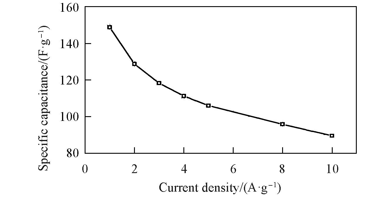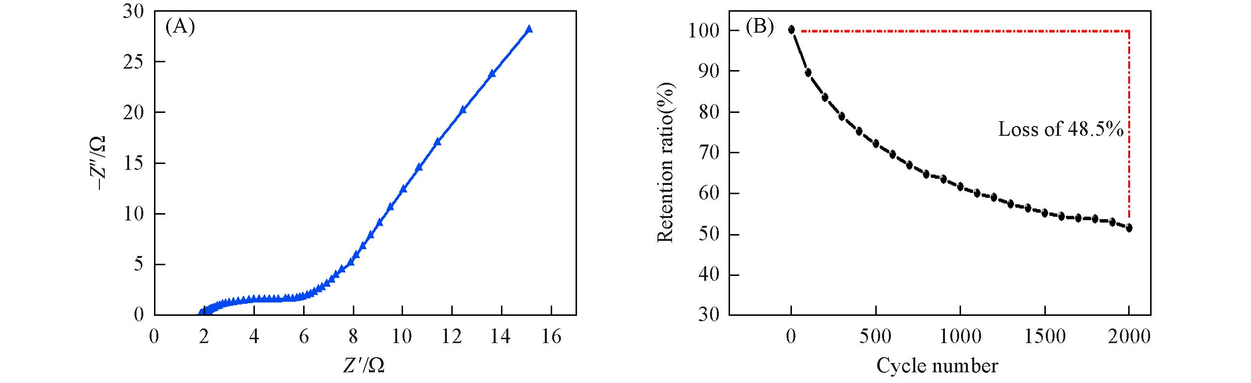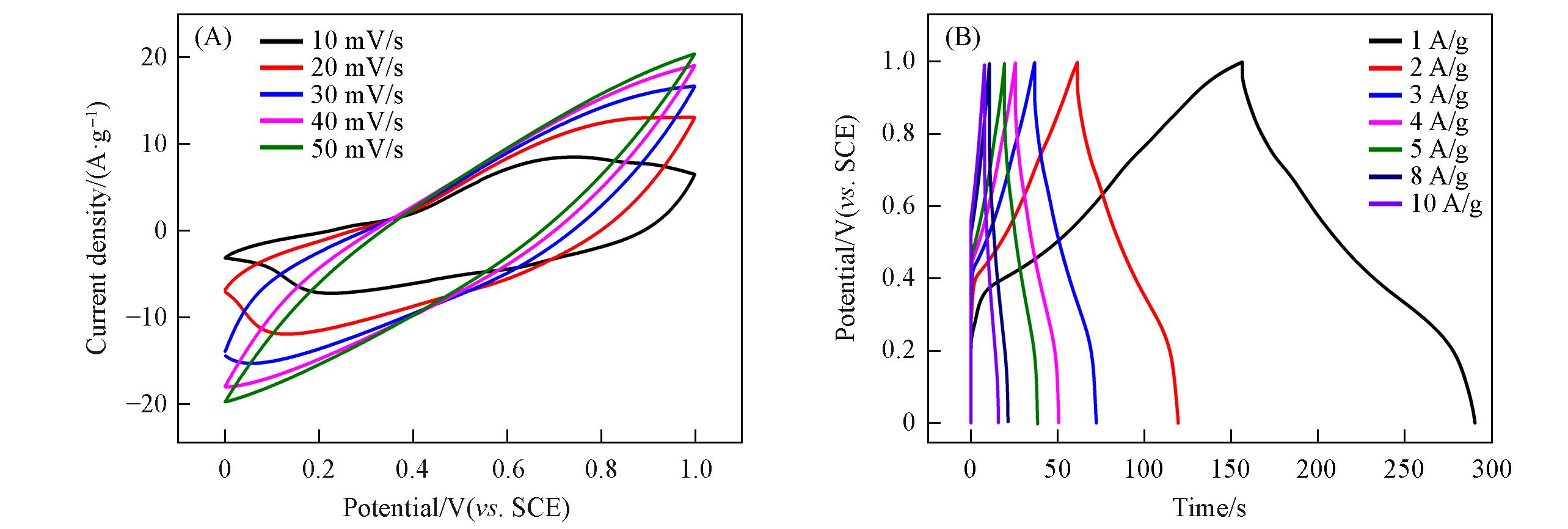 微纳结构电极具有高比表面积、 可调控的形貌和独特的尺寸依赖性, 可以在充放电过程中提供有效的活性反应位点、 改善电荷传输和存储, 从而在超级电容器中实现高效的电化学性能. 本文将苯胺单体溶解于弱酸性对甲苯磺酸/乙二醇/水混合溶剂中, 在冰水浴中通过苯胺单体氧化聚合制得低聚物片状模板; 然后将低聚物模板分散到溶有苯胺单体的硫酸水溶液中, 以过硫酸铵作为水溶性引发剂进一步引发聚合反应, 制备了具有纳米层级结构的花状聚苯胺(Polyaniline, PANI). 以导电碳布(CC)作为支撑基底, 将花状PANI用作超级电容器的电极材料, 对其电化学性能进行了研究. 结果表明, 在1 A/g的电流密度下, 花状PANI微纳结构电极的比电容值约为433 F/g; 当电流密度从1 A/g增加到10 A/g时, 比电容值降低了46.8%; 当电流密度为10 A/g时, 充放电循环2000次后的比电容损失率为48.5%. 用花状PANI制备的对称性PANI/CC||滤纸||PANI/CC全固态柔性超级电容器在550 W/kg功率密度下的最大能量密度约为20.65 Wh/kg.
