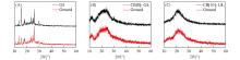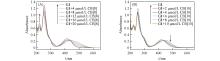 图1(A)为客体G1与CB[8]识别的核磁共振氢谱图. 由图1(A)可见, CB[8]浓度为1.0 mmol/L时, 可观察到自由和包合的客体分子的信号[图1(A)谱线d]以及CB[8]质子信号的分裂[图1(A)谱线g], 表明客体G1与CB[8]的结合在核磁时间尺度上表现为慢交换. 随着CB[8]浓度的增加, G1的吡啶鎓部分的质子信号峰He~Hi全部向高场有较大的移动(Δδ=?0.62, ?0.81, ?0.48, ?0.54, ?0.67), 蒽核部分的质子信号峰Ha向高场有较小的移动(Δδ=?0.20), Hb向低场轻微移动(Δδ=0.09), 烯键部分的质子信号峰Hc向低场轻微移动(Δδ=0.11), 而Hd向高场轻微移动(Δδ=?0.10). 质子信号峰的位移表明, G1的吡啶鎓部分位于CB[8]的空腔内, 蒽核部分位于CB[8]的羰基端口外围. 对图1(A)谱线g进行积分分析, 得知主客体的摩尔比约为1∶1, 而客体G1具有2个对称的吡啶鎓基团, 因此分子两端都会与CB[8]结合. 由此推测, CB[8]与G1以摩尔比2∶2的结合模式形成了主客体包合物, 即2个客体G1平行交错堆叠在2个CB[8]的空腔中[40]. 从二维NOESY核磁图谱可以看出, 吡啶鎓部分质子Hi与He~Hh的相关信号峰, 这种分子间的信号相关性进一步证明形成了摩尔比2∶2的主客体包合物(见本文支持信息图S16). 客体G2和G3与CB[8]的识别模式与上述结果相似, 核磁共振氢谱图见本文支持信息图S17和S18.