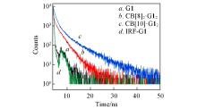 图1(B)为客体G1与CB[10]识别的核磁共振氢谱图. 客体G1与CB[10]的结合在核磁时间尺度上也表现为慢交换. 随着CB[10]浓度的增加, G1的蒽核部分的质子信号峰Ha, Hb和烯键部分的质子信号峰Hc, Hd向高场有较大的移动(Δδ=?0.95, ?0.85, ?0.57, ?0.43), 吡啶鎓部分的质子信号峰He~Hh向高场有轻微的移动(Δδ=?0.04, ?0.07, ?0.09, ?0.03), 而Hi略微向低场移动(Δδ=0.08). 质子信号峰的位移表明, G1的蒽核部分位于CB[10]的空腔内, 吡啶鎓部分位于CB[10]的羰基端口外围. 对 图1(B)谱线g进行积分分析可知, 主客体的摩尔比约为1∶2, 由此推测CB[10]与G1以摩尔比1∶2的结合模式形成了主客体包合物, 即2个客体G1平行交错堆叠在1个CB[10]的空腔中[41]. ESI-MS质谱分析也验证两者形成了摩尔比1∶2的主客体包合物, ESI-MS([C120H112ClN44O20]3+理论值), m/z:841.6274(841.9830)[CB[10]+2G1-3Cl?]3+(见本文支持信息图S19). 客体G2和G3与CB[10]的识别过程与上述结果相似, 核磁共振氢谱见本文支持信息图S20和S21.
