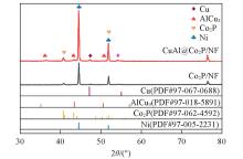 CuAl@Co2P/NF 的TEM照片进一步证明颗粒状CuAl均匀分布在Co2P的表面[图3(A)], CuAl@ Co2P/NF的高分辨率透射电子显微镜(HRTEM)照片展示了多个边界明显的异质界面[图3(B)], 其中, 0.19和0.22 nm晶格间距分别对应于Co2P的(201)和(112)晶面; 0.23 nm对应于Cu的(111)晶面, 验证了CuAl@Co2P/NF的形成. 由图3(B)的局部放大图可以清晰看到, AlCu3以及其它氧化物和氢氧化物与Co2P(112)晶面形成晶面与非晶面的异质界面, 这可能会影响电子分布, 并提供丰富的活性位点来锚定反应中间体[22~24].