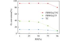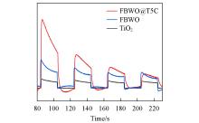 在75%相对湿度条件下进行了4×24 h长周期催化反应, 考察了催化剂的活性稳定性, 结果如图9所示. 测试的材料在长周期的可见光反应中, 均保持了较为稳定的催化效率. FBWO@T5C在4次循环中臭氧转化率从93%降至89%, 96 h性能损失约为4%. 在相同条件下, FBWO@T5转化率从27%降至25%, 活性损失仅为2%; TC的转化率从13%降至9%, 活性损失约 为4%. 这可能是由于可见光激发能量较弱, 因此表面空穴含量低, 仅能将少量氯基团转化为自由基 参与反应, 因此表现为可见光活性偏低, 但表面氯的损失率大幅下降, 催化活性可以维持较长的反应周期.