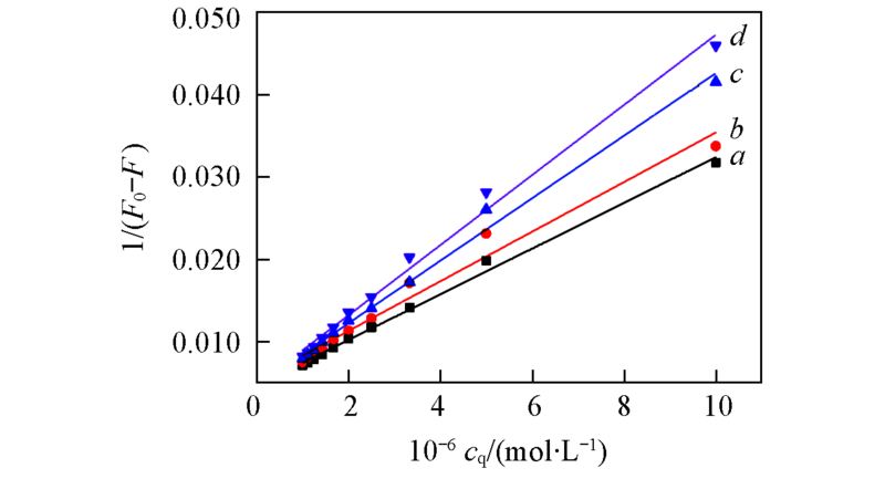 Fig.5 Stem-Volmer plots for the fluorescence quenching of BSA by APYP at different temperaturesa. 298.15 K, slope=1.0622, R=0.9996; b. 302.15 K, slope=1.0194, R=0.9985; c. 306.15 K, slope=0.9414, R=0.9987; d. 310.15 K, slope=0.9133, R=0.9977.
