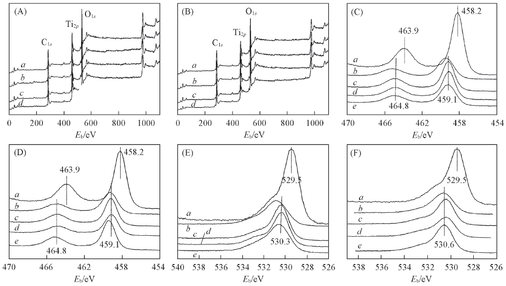 Fig.6 XPS spectra of MPT and MPT/CCF(A,B) Full spectra; (C,D) Ti2p; (E, F) O1s. (A) a. 2-MPT/CCF-400; b. 2-MPT/CCF-500; c. 2-MPT/CCF-600; d. 2-MPT/CCF-700. (B) a. 1-MPT/CCF-500; b. 2-MPT/CCF-500; c. 3-MPT/CCF-500; d. 4-MPT/CCF-500. (C), (E) a. MPT; b. 2-MPT/CCF-400; c. 2-MPT/CCF-500; d. 2-MPT/CCF-600; e. 2-MPT/CCF-700. (D), (F) a. MPT; b. 1-MPT/CCF-500; c. 2-MPT/CCF-500; d. 3-MPT/CCF-500; e. 4-MPT/CCF-500.