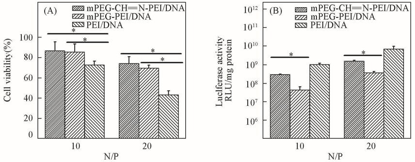 Fig.6 Cell cytotoxicity of HepG2 cells exposed to different nanoparticles with 1 μg DNA after incubation for 48 h(A) and in vitro transfection of the luciferase gene into HepG2 cells mediated by different nanoparticles for 48 h(B)(A) Error bars represent mean± SD for n=5; (B) error bars represent mean ±SD for n=3. * Denotes statistically significant difference at p<0.05.
