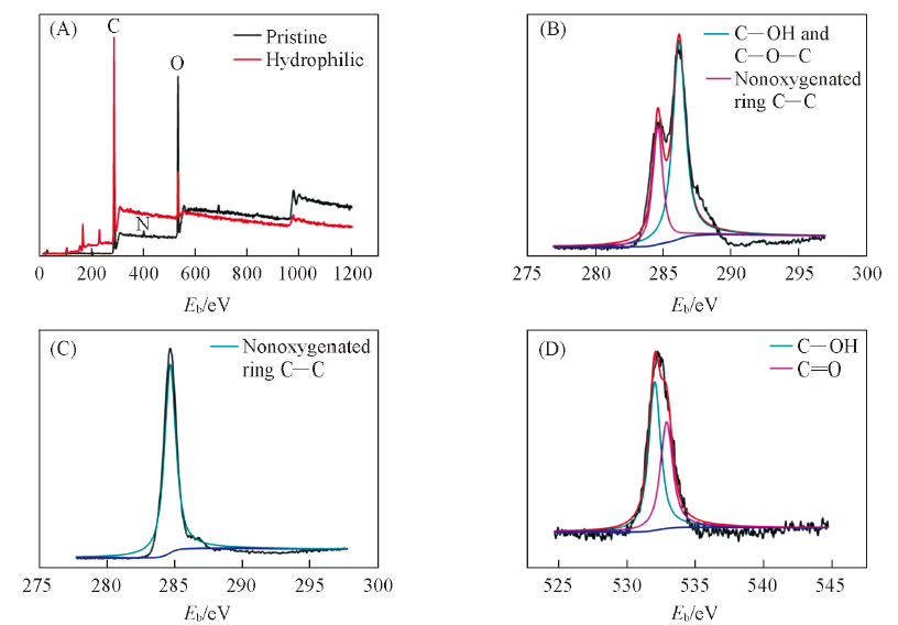 Fig.2 XPS spectra of pristine and hydrophilic[luffa-g-(PAM-co-PAANa)] luffa sponges(A), XPS spectra of C1s for pristine(B), XPS spectra of C1s(C) and O1s(D) for hydrophilic [luffa-g-(PAM-co-PAANa)] luffa sponge