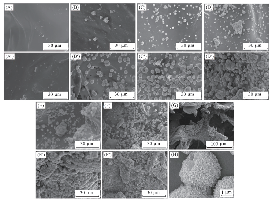 Fig.5 SEM images of the mineralized surface of PLGA hydrogels after soaking in 1.0SBF and 1.5SBF for different time (A—F) 2, 6, 10, 14, 21 and 28 d in 1.0SBF; (A'—F') 2, 6, 10, 14, 21 and 28 d in 1.5SBF; (G, H) different magnification in 1.5SBF for 14 d.