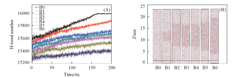 Fig.3 Growing status of the facet (020) in each system after 200 ns(A) The H-bond number between water molecules in each system; (B) snapshots of each system at 200 ns.