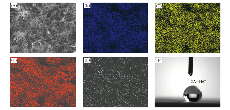 Fig.3 SEM image(A), EDS mapping scannings(B—E) and static wetting angle(F) of the sample prepared through molten salt reaction and silane coupling reaction treatment at 1000 ℃ Elemental content(molar fraction): (B) Al, 26.05%; (C) Si, 9.51%; (D) O, 57.24%; (E) C, 7.20%.