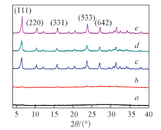 Fig.4 XRD patterns of samples with different crystallization timea. X-L2.0-60(36 h); b. X-L2.0-60(36 h)/100(1 h); c. X-L2.0-60(36 h)/100(2 h); d. X-L2.0-60(36 h)/100(4 h); e. X-L2.0-60(36 h)/100(12 h).