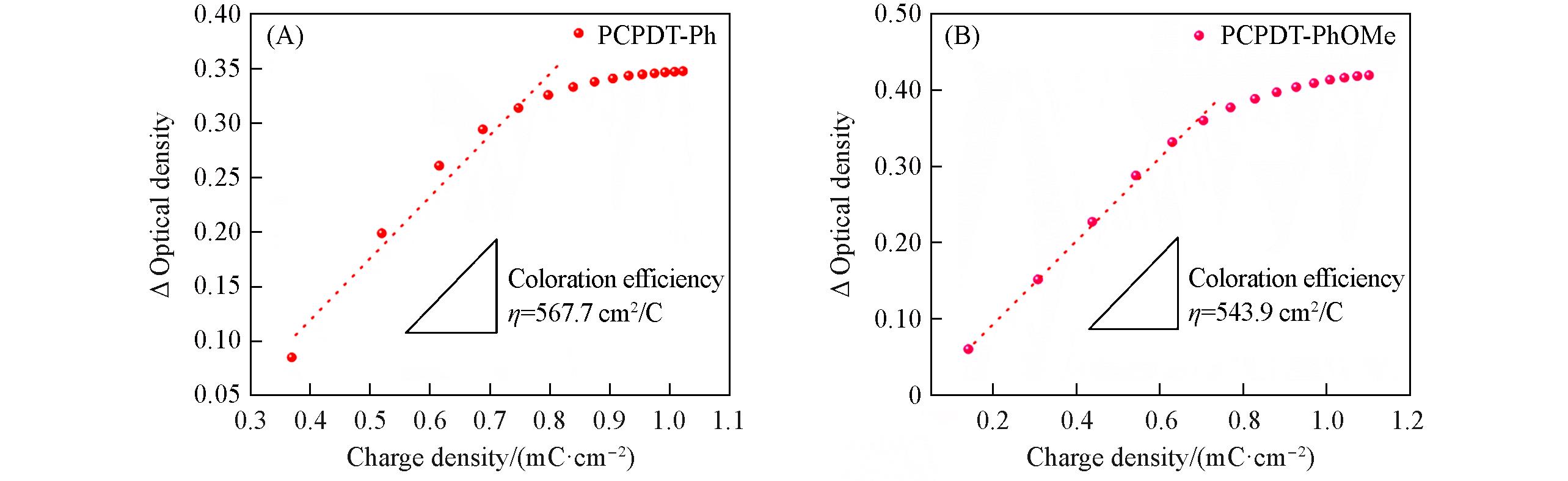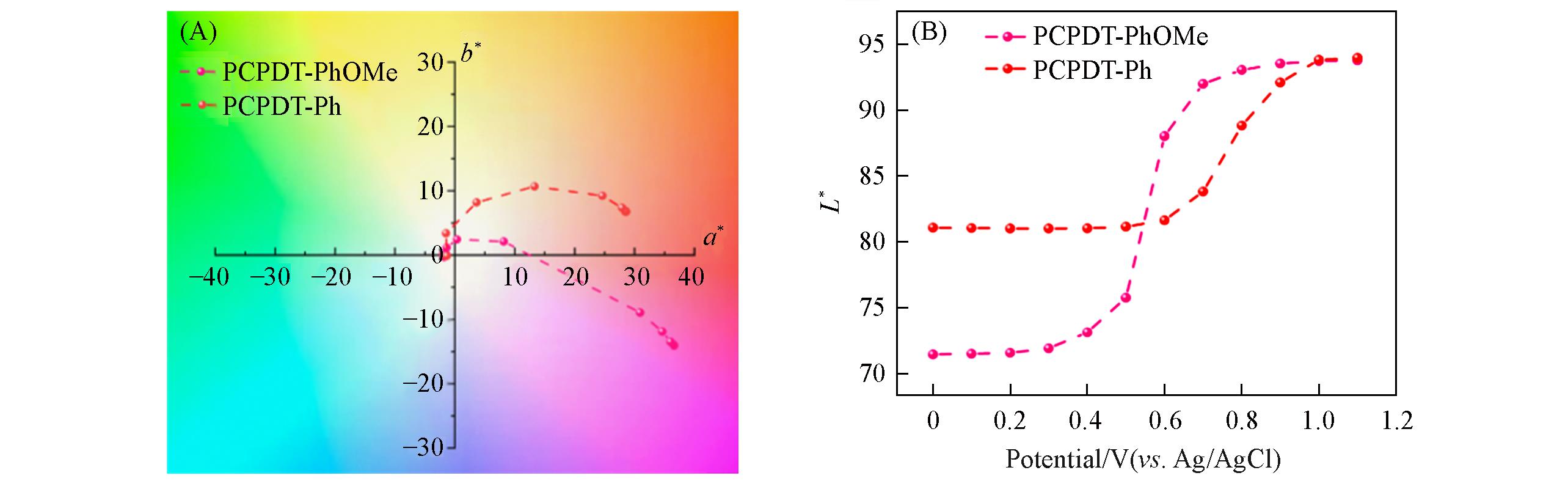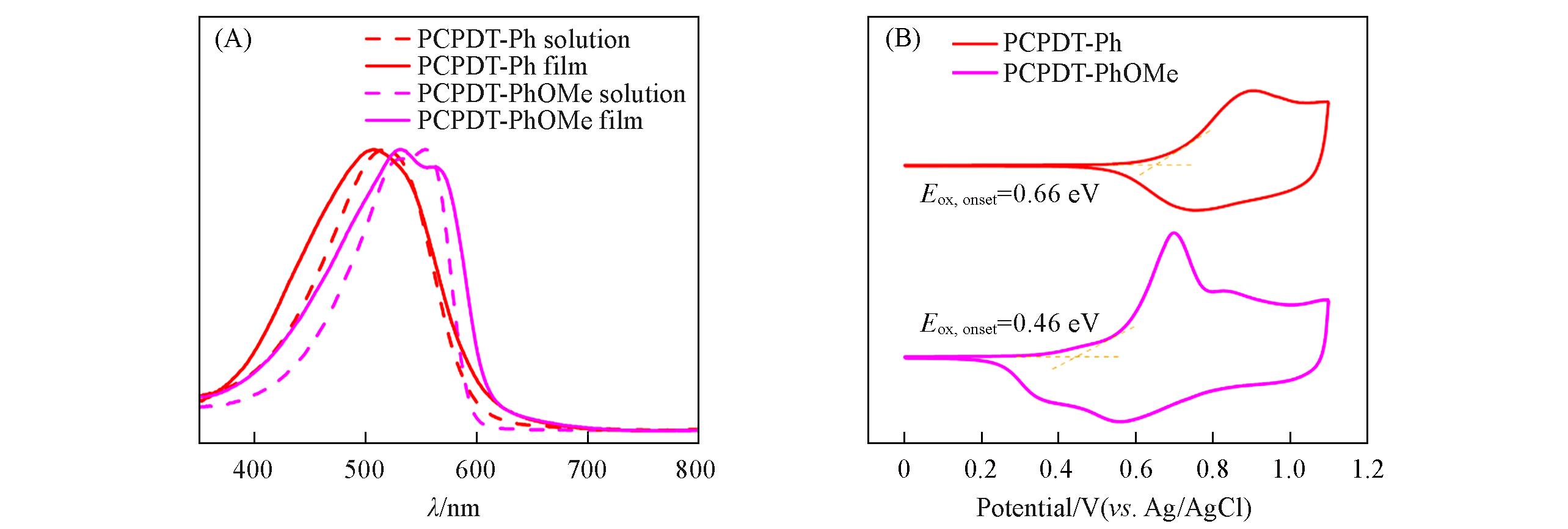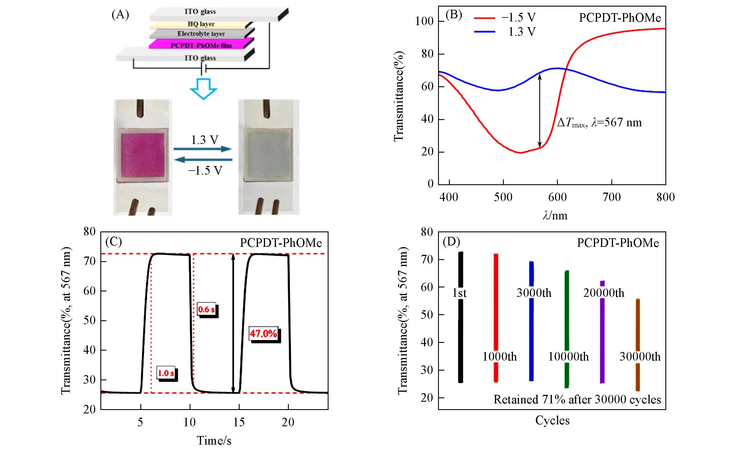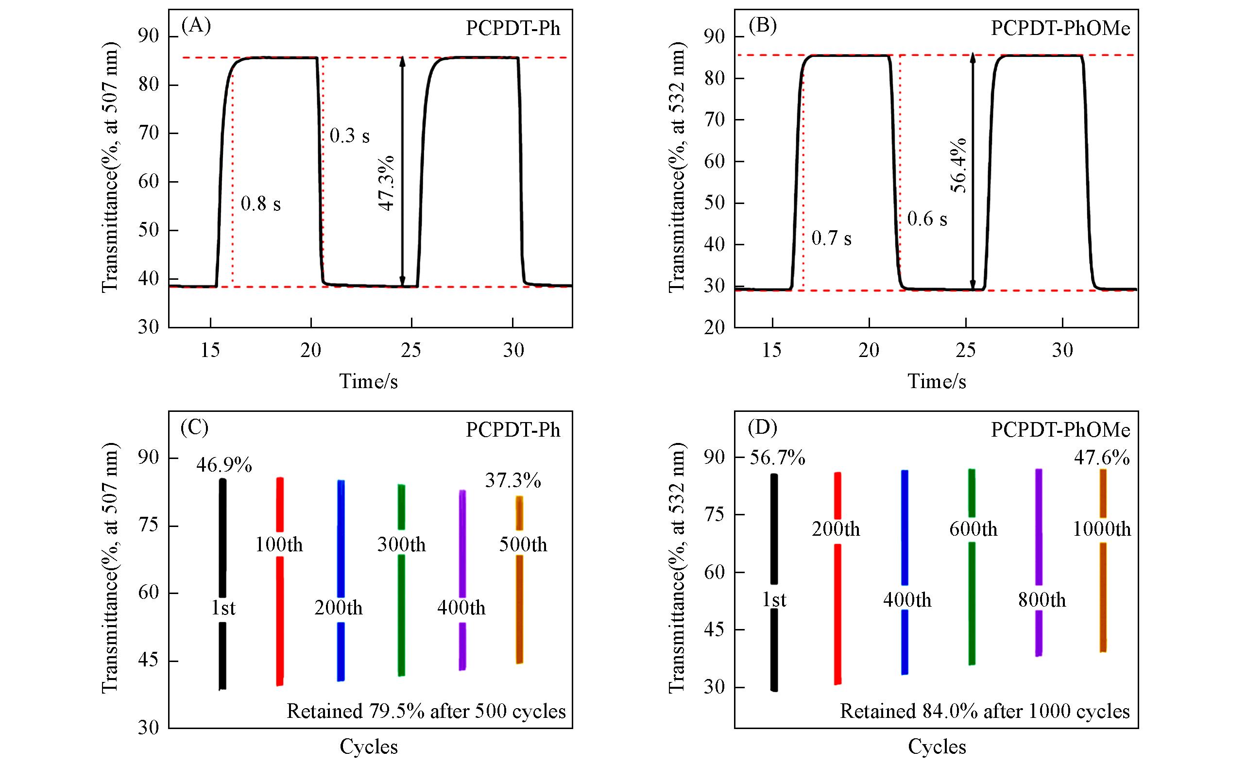 Cyclopentadithiophene(CPDT)-based polymers have emerged as promising research platforms for multicolor electrochromic materials due to their favorable color tunability. However, insufficient cyclic stability has hindered their translation into practical applications. In this study, two CPDT-based conjugated polymers with distinct substituent groups were designed and synthesized: PCPDT-Ph(copolymerized with unsubstituted benzene units) and PCPDT-PhOMe(copolymerized with dimethoxy-substituted benzene units). The influence of dimethoxy substitution on the electrochromic properties and stability of the polymers was systematically investigated. Electrochemical and electrochromic characterizations demonstrated that the electron-donating ability of the dimethoxy groups not only effectively regulated the polymer’s intrinsic properties but also significantly enhanced its cycling stability. Compared with PCPDT-Ph, PCPDT-PhOMe exhibited a reduced onset oxidation potential from 0.66 V(vs. Ag/AgCl) to 0.46 V, an upshifted highest occupied molecular orbital(HOMO) energy level, and a narrowed optical band gap(calculated theoretically) from 1.73 eV to 1.61 eV. The PCPDT-PhOMe film showed magenta in the neutral state and transparency in the oxidized state, with a color difference(ΔEab*) of 46.36. The coloring/bleaching response times were measured as 0.7/0.6 s, and the optical contrast retention reached 84% after 1000 cycles, outperforming the PCPDT-Ph film(79.5% retention after 500 cycles). Additionally, it exhibited a coloration efficiency of 543.9 cm²/C, demonstrating favorable comprehensive electrochromic performance. Electrochromic devices assembled with PCPDT-PhOMe achieved reversible switching between magenta and transparent states, with a response time of ≤1.0 s and a contrast retention of 71% after 30000 cycles, indicating good stability. This work clarifies the role of substituent electronic effects in regulating the electrochromic properties of CPDT-based polymers, providing experimental basis and theoretical support for the molecular design of solution-processable thiophene-based electrochromic materials. Furthermore, it validates the potential application of PCPDT-PhOMe in smart windows, electronic displays, and other related fields.