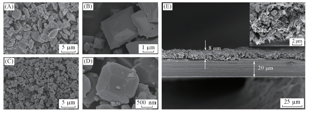 | Fig.1 SEM images of MIL-125(A, B), porous TiO2(C, D) and separator coated with TiO2/CNTs composite material(enlarged in the inset)(E) |
