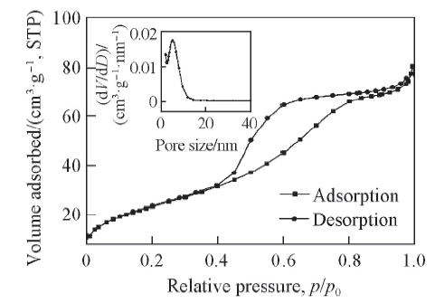 图4为多孔TiO2的氮气吸附-脱附等温线和孔径分布图. TiO2的吸附等温线为典型的Ⅳ 型等温线, 在相对压力0.4~1.0范围内有1个明显的滞后环, 证明TiO2材料中存在介孔和微孔结构. 根据BET模型计算得到多孔TiO2的比表面积为84.84 m2/g, 根据BJH模型计算得到TiO2的平均孔径为4.29 nm.