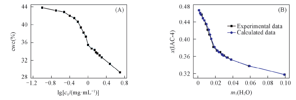 图5(A)给出了临界水含量(cwc)与IAC-4初始浓度对数值的关系图(半对数坐标图), 其中初始浓度为0.1, 0.2, 0.3, 0.4, 0.5, 0.6, 0.7, 0.8, 0.9和1.0 mg/mL的临界水含量取自文献[24]. 对于两亲性聚合物的自组装体系, 临界水含量与初始聚合物浓度对数呈现反比例线性关系[29]. 然而, IAC-4小分子自组装体系中, 临界水含量与初始浓度对数的关系比较复杂, 并不呈现反比例线性关系. 如我们在前期研究[24]中报道, 虽然临界水含量与初始浓度对数的关系在不同初始浓度区域内呈现近似的反比例线性关系(3个区间分别为0.1~0.5, 0.5~0.9和1.0~5.0 mg/mL), 但其斜率各不相同.