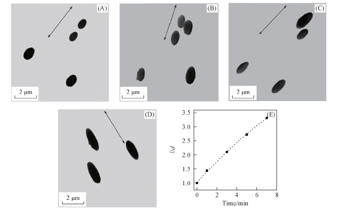 利用线性偏振激光垂直辐照(488 nm, 100 mW/cm2), 研究了IAC-4微球的快速光致形变特性. 向初始浓度为1.6 mg/mL的THF溶液中滴加2 mL去离子水, 然后快速加入20 mL去离子水于混合体系中得到IAC-4胶体球. 将其水分散液滴加到铜网上, 在空气环境中室温干燥24 h后, 放置于真空烘箱中室温干燥12 h, 制备得到固态IAC-4微球. IAC-4分子中含有偶氮苯生色团, 其在偏振光辐照下可以发生顺反异构, 使得IAC-4分子发生质量迁移, 产生IAC-4微球沿光偏振方向的形变[23, 24]. 如图6(A)所示, 当辐照时间仅为1 min时, IAC-4微球快速发生了拉伸形变(图中箭头表示偏振方向), 形成椭圆形的粒子, 其平均长径比(l/d)可达1.44(统计不低于100个形变粒子). 图6(B)~(D)表明, 随着光辐照时间延长至3, 5和7 min时, IAC-4微球的拉伸形变程度变大, 甚至形成棒状的粒子. 图6(E)显示, 随光照时间的增加, 形变后粒子的平均长径比持续增大: 从1.44分别增大至2.06, 2.69和3.32. IAC-4微球的光致形变速度远远大于偶氮聚合体微球体系(CH-AZ-CA)[14], 这将促进各向异性粒子和光响应性粒子的制备和应用.