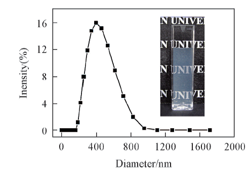 带正电荷的CHI和带负电荷的CSS基于静电相互作用以4∶ 1的单体摩尔比复合形成CHI-CSS聚合物复合物[Scheme 1(Ⅰ )]. 制备的CHI-CSS复合物溶液是分散均一的胶体溶液, 具有良好的稳定性, 在室温下放置7 d状态并未发生变化. 利用动态光散射(DLS)研究CHI-CSS复合物的尺寸和表面ζ 电势, 结果如图1所示. 在pH=6时, CHI-CSS复合物的平均流体力学直径为369 nm. CHI-CSS复合物中过量的CHI, 使其表面带正电荷, 表面电势为(34.7± 1.5) mV. 调节pH=5时, CHI-CSS复合物的尺寸没有发生变化, 表面电势升高为(43.1± 3.4) mV. 对比CHI-CSS复合物在不同pH条件下的尺寸和电势, 推断 CHI-CSS复合物为具有核壳结构的胶体粒子, 内部是由聚阳、 阴离子复合形成的内核, 外层是过量的CHI构成的亲水的外壳层[38, 39]. 带正电荷的亲水性壳层使复合物在水溶液中能够稳定均匀地分散. 当pH降低时, 复合物的尺寸并未发生变化, 仅仅是由于壳层氨基质子化程度的增加而引起表面ζ 电势的增大.