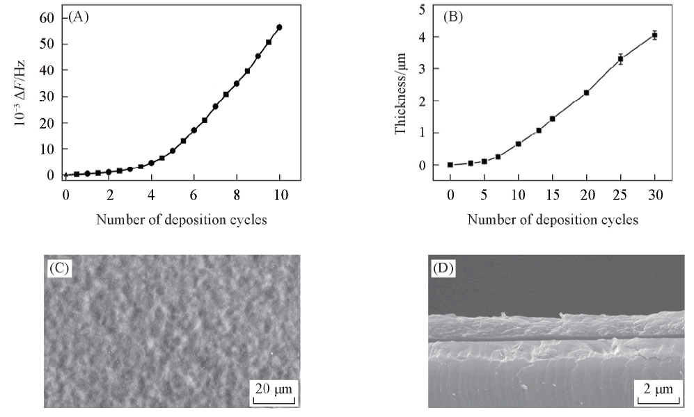 QCM-Z500型石英晶体微天平(QCM), KSV公司, 基片为双面镀银的QCM石英晶振片(F0=9 MHz). 聚合物膜的厚度利用Dektak 150探针式表面轮廓仪测定. Nanoscope Ⅳ 型原子力显微镜(AFM), 布鲁克公司. XL30 ESEMFEG场发射扫描电子显微镜(SEM), 飞利浦公司, 样品表面经过喷金处理. Shimadzu UV-2550 spectrophotometer紫外可见吸收光谱仪, 岛津公司. Agilent 1200型高效液相色谱仪, 安捷伦公司. 数码照片由Canon Power Shot S3相机拍摄.