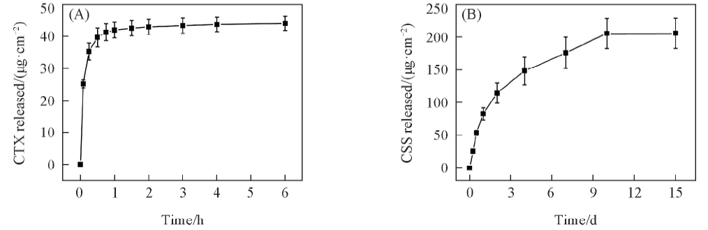 1.2.3 药物分子的负载及释放 大分子药物CSS通过CHI-CSS复合物层层组装到聚合物膜中. 小分子抗生素药物CTX通过后扩散的方法负载到CHI-CSS/HA聚合物复合物膜中. 将CHI-CSS/HA聚合物复合物膜浸泡在CTX(35 mmol/L, pH=5)的水溶液中1 h便可以实现CTX分子在CHI-CSS/HA聚合物复合物膜中的饱和负载.