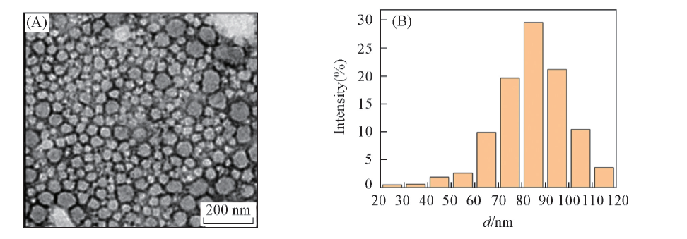 图1(A)为纳米乳液中纳米粒子的透射电子显微镜(TEM)照片, 可见, 纳米粒子呈较整齐均匀的球形. 图1(B)示出了统计后纳米粒子的粒径及分布, 可见, 其粒径主要分布在60~110 nm范围内, 平均粒径为84 nm, 比通过动态光散射测得的粒径(96 nm)偏小, 这其是由于干态下纳米粒子收缩所致.