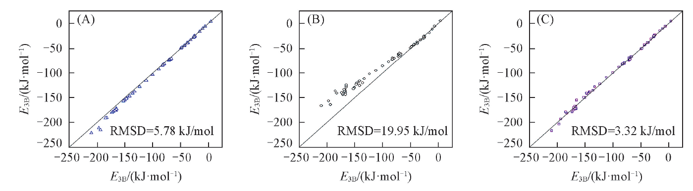 表5给出了不同方法相对于CCSD(T)总三体作用能的误差统计. 图1为本文方法的总三体作用能与CCSD(T)结果间的相关性图.