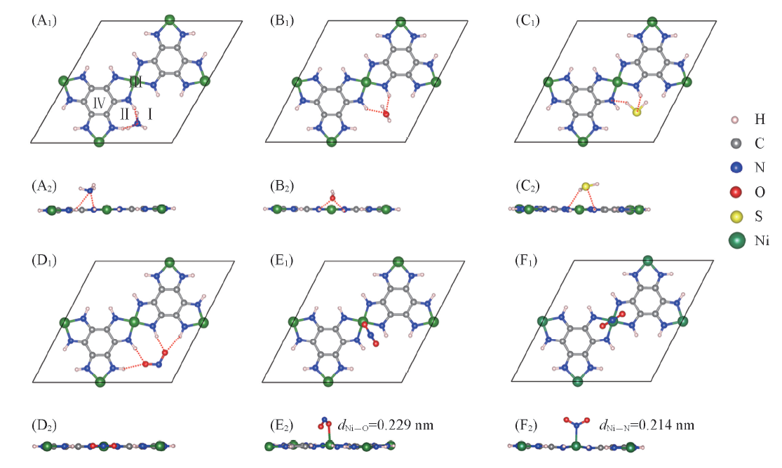 表1列出了二维Ni3(HIB)2薄膜吸附不同分子后薄膜中的H与吸附分子的最近距离(dH— X), 其中H表示薄膜亚氨基中的氢原子, X表示气体分子的原子, 分别对应N(NH3), O(H2O)和O(NO2)原子. 对于几种分子的吸附, dH— X的大小顺序为0.179 nm(NO2)< 0.229 nm(H2O)< 0.247 nm(NH3), 说明NO2分子与亚氨基的相互作用最强, H2O和NH3与亚氨基形成的氢键稍弱. H2S分子与之不同, H2S与亚氨基中的H形成的氢键 S…H— N键长(0.294 nm)大于H2S与亚氨基中的N形成的氢键S— H…N键长(0.259 nm), S— H…N氢键如图3(C1, C2)中的红色虚线所示. 对比其它3种分子, H2S分子形成的氢键最弱. NO2吸附在亚氨基附近(Ⅰ 位)的结构如图3(D1, D2)所示, NO2与薄膜在同一平面内, 其中一个O原子同时靠近薄膜2个亚氨基中的H原子, 最近的距离是0.179 nm, 形成O…H— N类型的氢键. 另外, NO2与其它3种气体分子的吸附不同, NO2分子不但与薄膜的H相互作用, 还可以通过O或N与Ni离子形成配位键, 图3(E1, E2) 和(F1, F2)给出了2种Ⅲ 吸附构型, 2种结构中Ni— O与Ni— N的距离分别为0.229和0.214 nm.