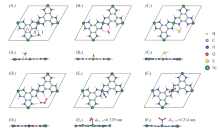 实验发现有机小分子的吸附导致基于Ni或Cu离子的二维MOFs材料的导电性发生显著变化, 对于不同的有机分子, 电导的响应不同[20]. 甲醇和乙醇能提高Ni3(HITP)2(HITP=2, 3, 6, 7, 10, 11-hexaiminotriphenylene)薄膜的电导率, 但是降低Cu3(HITP)2薄膜的电导率; Ni3(HITP)2对胺类和醚类分子无响应, Cu3(HITP)2在胺类和醚类分子的氛围中电导率有显著降低[23]. 2种薄膜的结构相似, Cu, Ni产生不同的响应以及吸附作用的本质还不明确. Smith等[24]在聚合物薄膜上制备了Ni3(HHTP)2和Cu3(HHTP)2(HHTP=2, 3, 5, 6, 10, 11-hexahydroxytriphenylene)的气体传感阵列, 利用石墨电极测量薄膜的导电性质, 发现2种阵列传感器可区分H2O, NH3, NO和H2S气体. 而基于稀土元素的MOFs结构对H2S和NO2表现出较高的灵敏度和良好的选择性[25], 对H2S的检测下限可以达到5.4 ng/mL. Sarkar等[26]发现铁磁性的Co3C12S12吸附CO后磁性及电导率均有显著变化, 有可能应用于气体传感器. Liu等[27, 28]发现吸附气体分子能够调控二维Ni3C12S12薄膜电学性质, 化学吸附的CO和NO 使单层薄膜由半导体性质变为金属性质, 电导率明显增加, 而物理吸附的O2对体系性质基本没有影响.