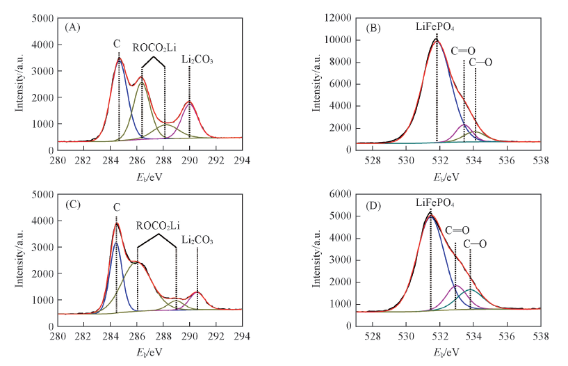 对低温循环后的电极表面进行XPS光谱测定. 由图8可见, 电解液添加DESCN的电池电极表面检测到DESCN中的Si元素和— CN键中的N元素, 表明DESCN化合物参与电极表面SEI膜的形成. 图9中C1s谱图中电解液未添加DESCN和添加2%DESCN的电池低温循环后电极表面有明显不同. 在284.4 eV处的强峰是C的特征峰, 在285.9和288.9 eV处的峰分别对应于C— O和C≡ O, 主要来自烷基锂和聚碳酸酯[29], 而290.5 eV处的峰与Li2CO3相关[30]. 电解液未添加DESCN的电池电极表面的Li2CO3峰的相对含量为3.32%, 而电解液添加2%DESCN的电池电极表面的Li2CO3相对含量明显减少, 为1.96%, Li2CO3主要是碳酸酯溶剂分解的反应产物, 是SEI膜中的不稳定组成, 与前面SEM和EDS的测试结果一致, 表明DESCN参与形成的SEI膜更稳定. O1s XPS谱图中的峰主要对应于锂的氧化物LiFePO4(531.4 eV)[31]和聚碳酸酯和碳酸锂盐中的C≡ O键(533~533.5 eV)和C— O键(533~534 eV). 电解液未添加DESCN的电池电极表面LiFePO4的相对含量为36.12%, 比电解液添加2%DESCN的电池电极表面LiFePO4相对含量(19.47%)更高; 而前者的C≡ O键和C— O键相对含量分别为3.71%和3.81%, 也比后者的3.52%和2.79%更高, 表明添加DESCN形成的SEI膜更均匀地覆盖在电极表面, 并且可抑制电解液的分解. XPS和SEM结果表明添加剂DESCN有助于在LiFePO4电极表面形成更薄、 更稳定、 更均匀、 更导电的SEI膜, 从而改善电池的低温性能.