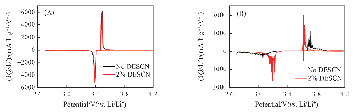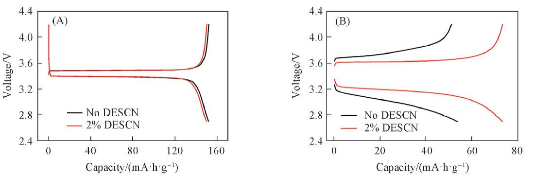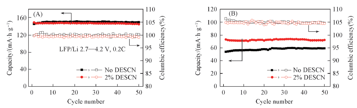 电池组装: 在Ar气保护手套箱内, 以LiFePO4电极片为正极, 金属锂片为负极, Celgard 2400膜为隔膜, 采用基础电解液和添加2%(体积分数)DESCN的电解液分别组装成CR2025型扣式半电池.