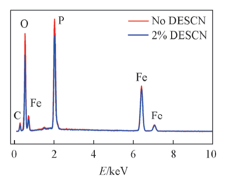 此外, 采用EDS对电极表面扫描发现, 对比电解液未添加DESCN的电池, 电解液添加2%DESCN的电池电极表面的氧、 磷和铁元素峰强度明显降低(图7), 表明电极表面被SEI膜均匀包覆, 有更少的LiFePO4颗粒露出. 从表2的表面元素含量可见, 电解液添加2%DESCN的电池电极表面碳、 氧元素相对含量较低, 可能是由于DESCN在电极表面形成均匀且致密的SEI膜, 抑制了电解液副反应发生(如碳酸酯溶剂的分解反应)[28], 减少了烷基锂和碳酸锂等反应产物的含量. 另外, 电解液未添加DESCN的电池电极循环后表面的磷和铁元素的含量明显降低, 表明形成的SEM膜更厚且不均匀, 所以活性物质元素含量低; 而电解液添加DESCN的电池电极表面的磷和铁元素含量与循环前接近, 表明DESCN化合物在电极表面形成的SEI膜更薄更均匀.