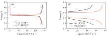 图2为使用基础电解液未添加和添加2%DESCN电解液的LiFePO4/Li 电池分别在25 ℃(A)和-20 ℃(B)下的充放电曲线. 由图2可知, 在25 ℃下, 两组电池的充放电曲线十分相似, 使用未添加DESCN和添加2%DESCN电解液的电池首次放电比容量分别为151.6 mA· h/g和149.6 mA· h/g; 而在-20 ℃下, 含有2%DESCN的电池则表现出更高的放电电压平台和放电比容量, 电池具有较小的极化, 使用未添加DESCN和添加2%DESCN电解液的电池, 放电比容量分别为54 mA· h/g和73 mA· h/g.