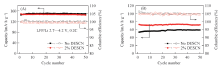 图3为未添加DESCN和添加2%DESCN的LiFePO4/Li 电池分别在25 ℃(A)和-20 ℃(B)下的循环曲线. 在25 ℃, 经过50次循环, 两组电解液的电池都循环稳定, 放电比容量接近约150 mA· h/g, 库仑效率大于99%. 当温度下降为-20 ℃时, 使用含2%DESCN电解液的电池容量得到了明显的提高, 放电比容量约为73 mA· h/g, 而使用未添加DESCN 电解液的电池放电比容量仅有58 mA· h/g. 两组电池的循环稳定性和库仑效率都较好, 这与LiFePO4材料的稳定性和循环次数少有关. 结果表明, 添加DESCN有利于提高电池低温性能.
