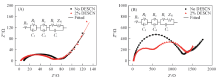 为了确定DESCN能够改善LiPFeO4/Li 电池低温性能, 测试了LiPFeO4/Li 电池分别在25和-20 ℃下循环后的电化学阻抗谱(EIS), 结果如图5所示. EIS的Nyquist曲线由3部分组成, 即高频区域半圆(HFA)、 中频区域半圆(MFA)和低频区域的斜线, 阻抗值由等效电路拟合(图5插图)[27]. 其中, R0代表电解液的电阻, Rf和Rc分别为SEI膜阻抗和电荷转移阻抗, Cf和Cd是相对应的电容, Ri和Ci表示电子电阻和相关电容, ZW表示Warburg 扩散阻抗. 在25 ℃时[图5(A)], 首次循环后电解液添加2%DESCN的电池比电解液未添加DESCN的电池具有更小的R0(2.72 vs. 8.76 Ω )和Rf(15.36 vs. 20.46 Ω ), 表明添加DESCN有利于减小电池内部极化, 在首次循环后改善电极表面SEI膜的形成. 在-20 ℃时[图5(B)], 使用两组电解液的电池循环后阻抗均明显增大, 电解液添加2%DESCN的电池相对电解液未添加DESCN电池的低温反应电阻减小, 电池阻抗降低, 与循环性能测试中电池放电比容量提高结果一致, 表明添加DESCN可以有效降低电极的极化, 改善SEI膜性能, 提高锂离子在电极/电解液界面的传输速率.