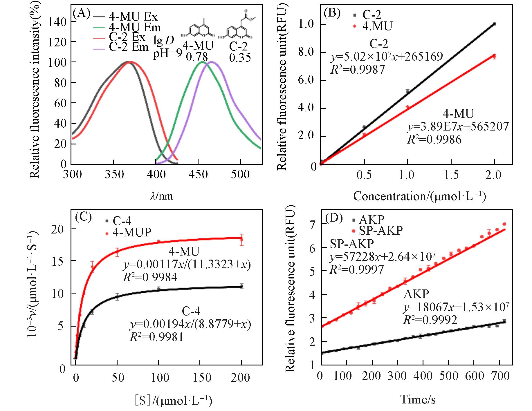 | Fig.1 Basic property characterization of 4?MU, C?2, 4?MUP, C?4 and SP?AKP (A) The fluorescence spectra and partition coefficients(lg D) of 4?MU and C?2; (B) the fluorescence intensity standard curves of 4?MU and C?2; (C) the Michaelis?Menten equation of corresponding substrate C?4 and 4?MUP; (D) the catalytic activity comparison of AKP and SP?AKP. The concentrations of AKP and SP?AKP are 1×10-6 mg/mL and 12.17×10-6 mg/mL, respectively. |