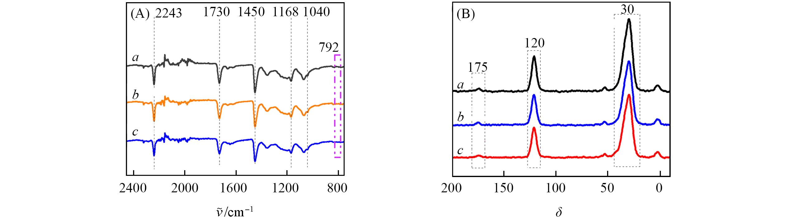 | Fig.4 FTIR(A) and 13C NMR(B) spectra of PAN fibers with different cross?linking degrees a. PAN; b. PAN?IR200; c. PAN?IR300. |
