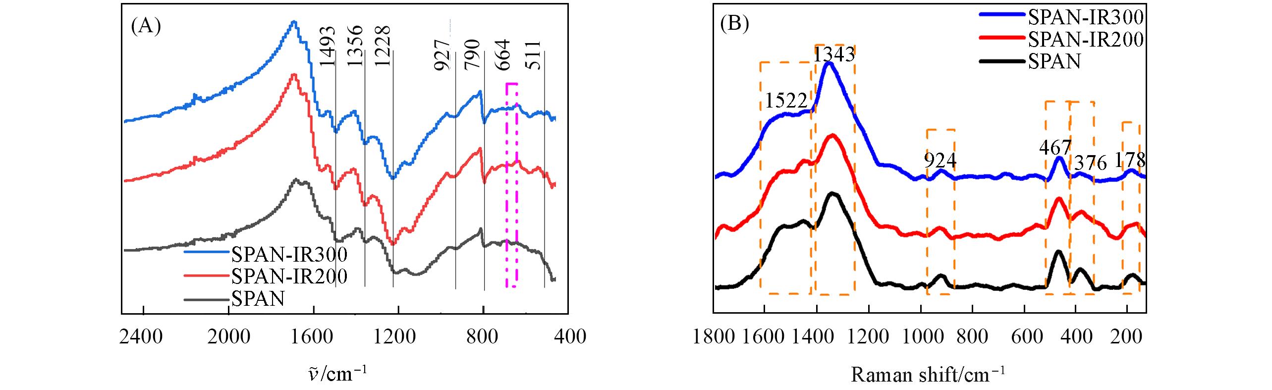 | Fig.7 FTIR(A) and Raman(B) spectra of SPAN with different cross?linking degrees |