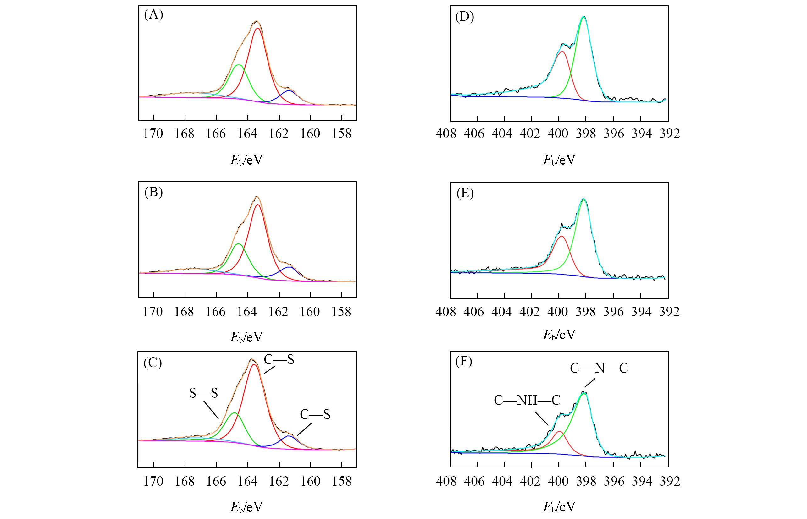 | Fig.8 S2p (A—C) and N1s (D—F) XPS spectra of SPAN with different cross?linking degrees (A, D) SPAN?IR300; (B, E) SPAN?IR200; (C, F) SPAN. |