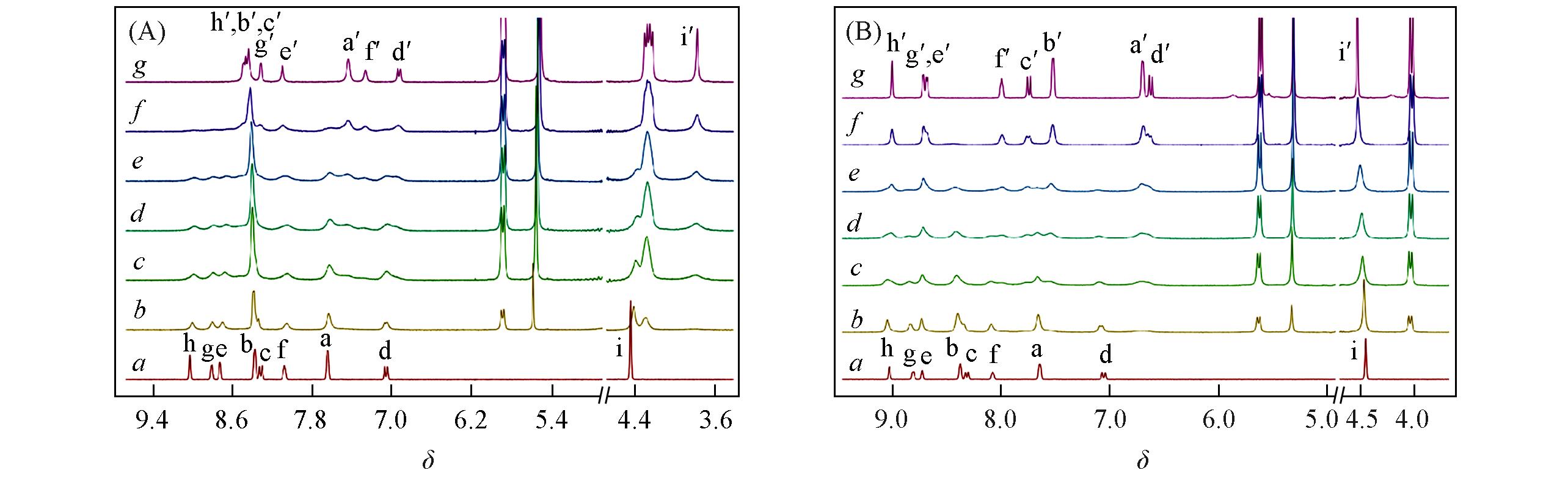 | Fig.1 1H NMR spectra of G1(D2O, 600 MHz, 298 K, 2.0 mmol/L) with 0(a), 0.4(b), 0.8(c), 1.0(d), 1.2(e), 1.6(f) and 2.0(g) mmol/L of CB[8](A) and 1H NMR spectra of G1(D2O, 600 MHz, 298 K, 2.0 mmol/L) with 0(a), 0.2(b), 0.4(c), 0.5(d), 0.6(e), 0.8(f), and 1.0(g) mmol/L of CB[10](B) |