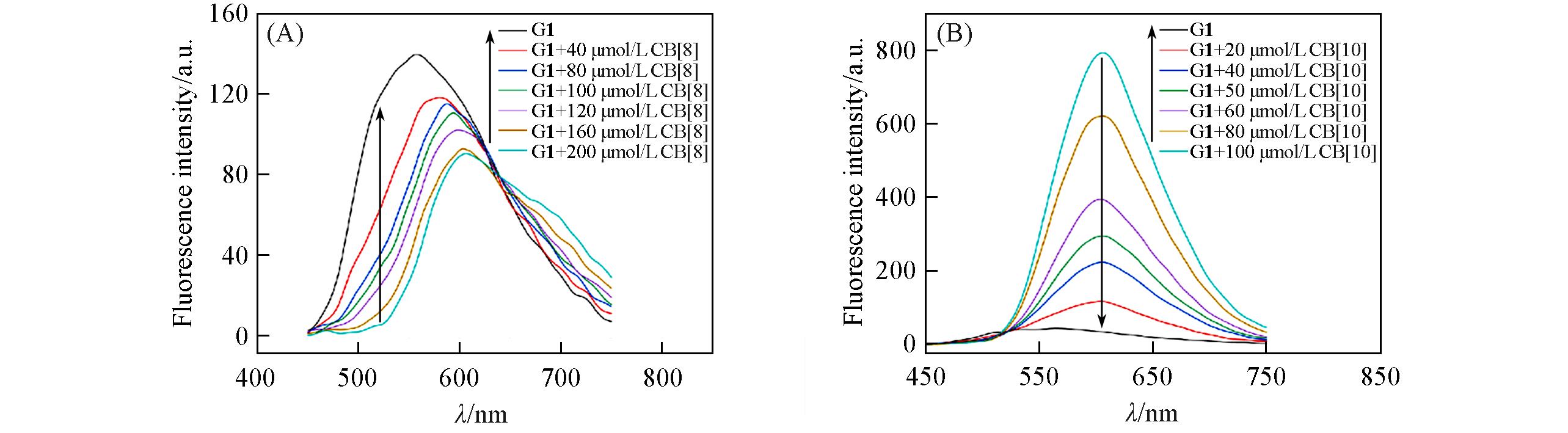 | Fig.3 PL spectra of G1(200 μmol/L in H2O) with different amounts of CB[8](0—200 μmol/L)(A) and CB[10](0—100 μmol/L)(B)(λex=420 nm) |
