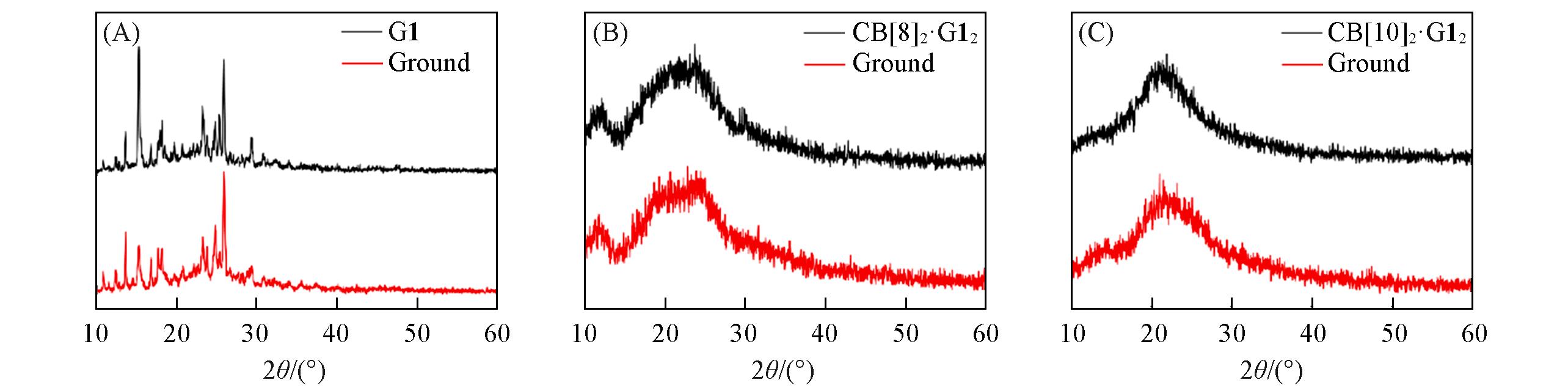 | Fig.6 PXRD patterns of G1(A), CB[8]2·G12(B) and CB[10]·G12(C) in different states |