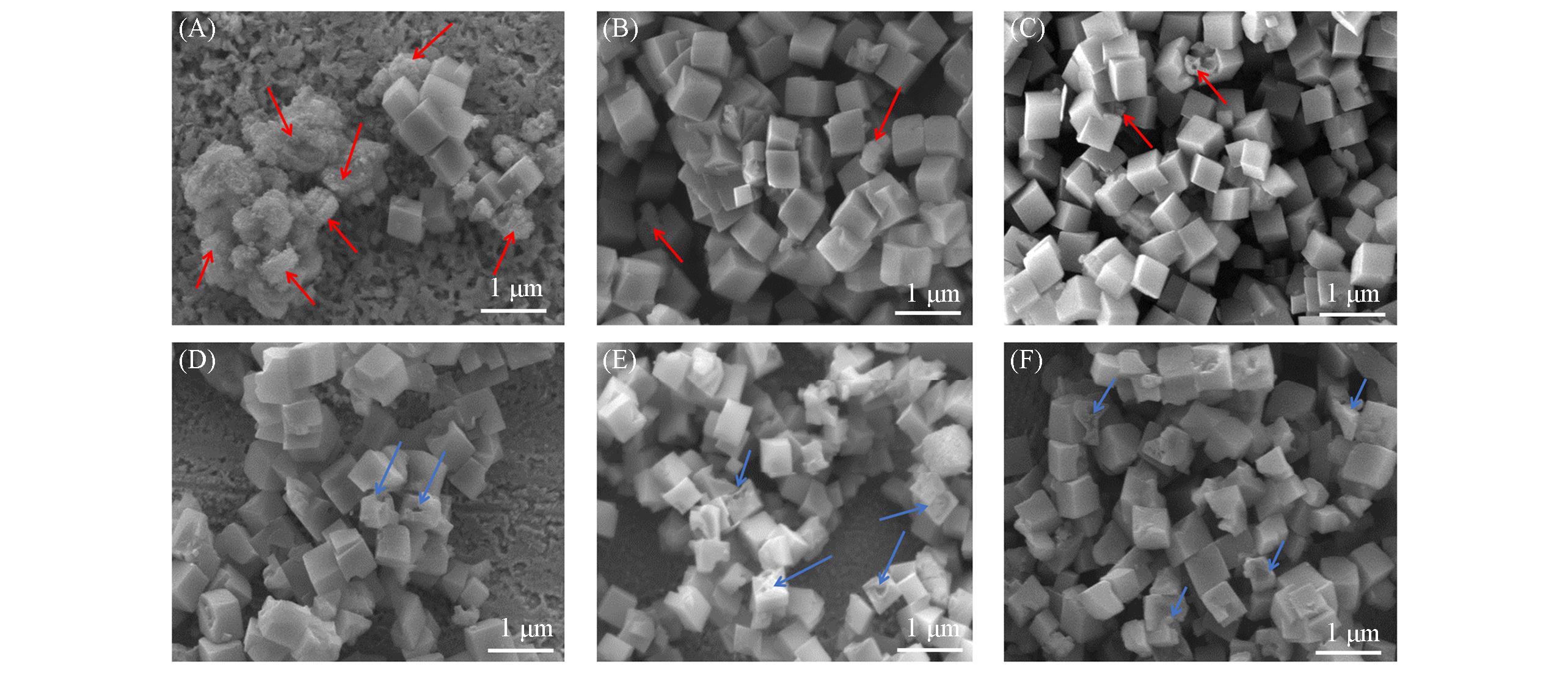 | Fig.3 SEM images of SSZ⁃13 samples crystallized for 1.5 h(A), 3 h(B), 4.5 h(C), 6 h(D), 8 h(E) and 10 h(F) |