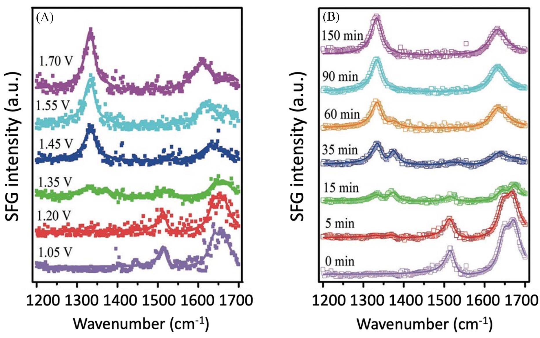 | Fig.5 Sum Frequency Generation(SFG) spectra recorded at the working electrode/electrolyte interface after running the cell at various voltages for 90 min(A) and by monitoring the reaction at different times at 1.45 V(vs. RHE) in 1 mol/L KOH and 20 mmol/L HMF(B)[ Copyright 2019, Wiley-VCH GmbH. |
