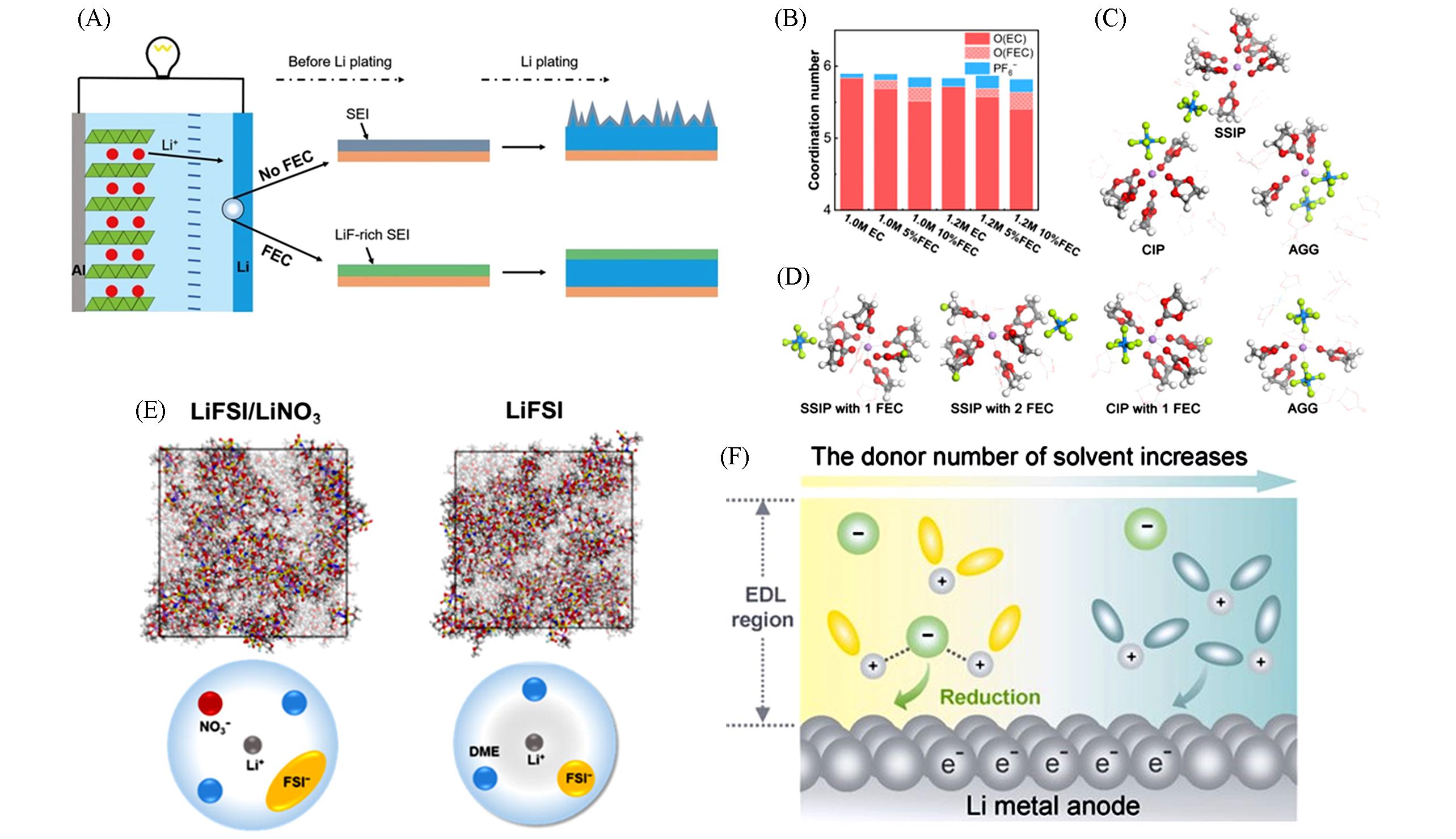 | Fig.2 Schematic of the effect of FEC additives on a Li metal anode(A) [ (A) Copyright 2017, John Wiley and Sons; (B—D) Copyright 2019, Elsevier; (E) Copyright 2019, American Chemical Society; (F) Copyright 2021, John Wiley and Sons. |