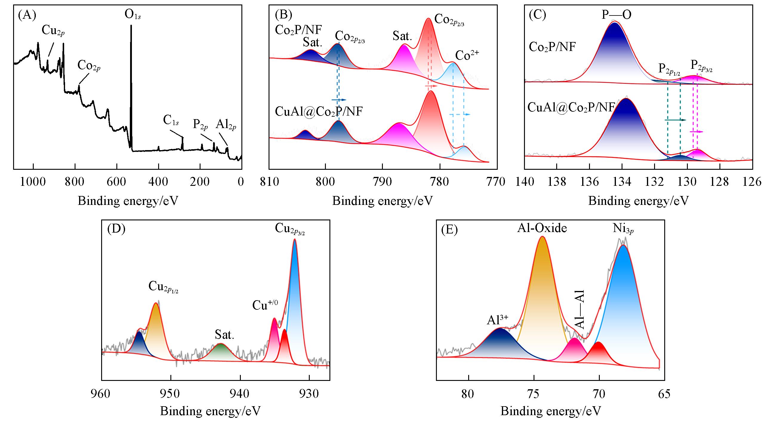 | Fig.5 XPS spectra of survey scan(A), Cu2p (D) and Al2p (E) of CuAl@Co2P/NF, XPS spectra of Co2p (B) and P2p (C) of CuAl@Co2P/NF and Co2P/NF |