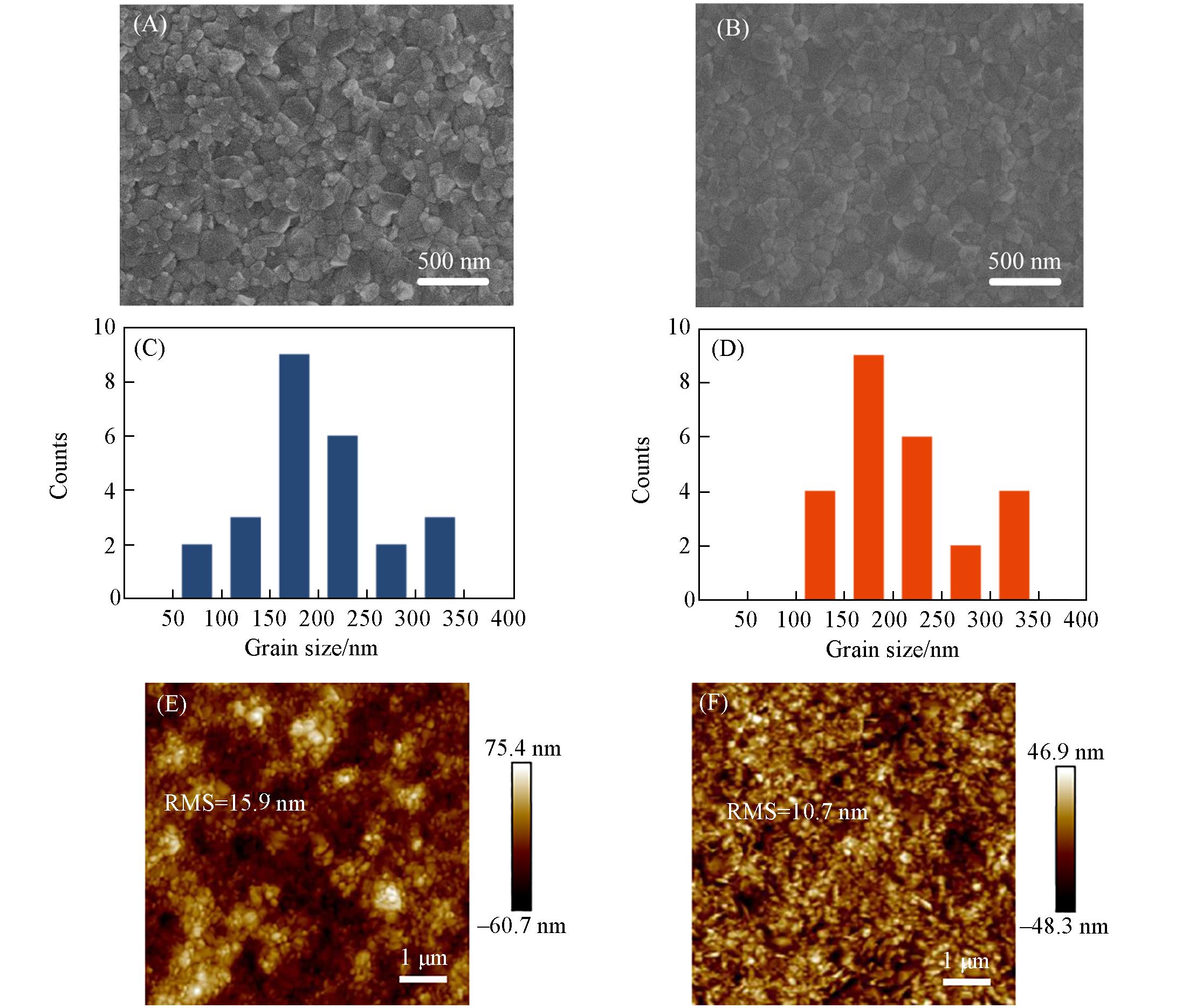 | Fig.3 SEM images(A, B), the corresponding size distributions of the grains(C, D) and AFM images(E, F) of control perovskite film(A, C, E) and target perovskite film(B, D, F) |