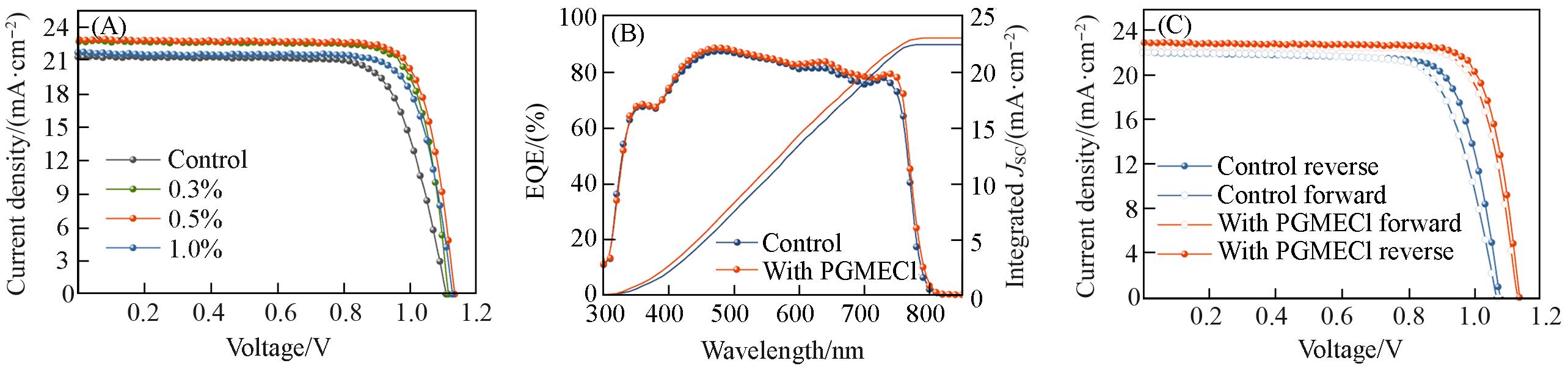 | Fig.9 J⁃V curves of PSC after adding perovskite with different concentrations of PGMECl(A), EQE spectra of the control and target devices(B), reverse and forward scan J⁃V curves of the best PSCs with and without PGMECl(C) |